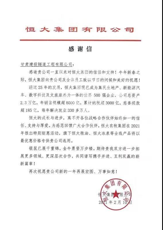 新春之礼,隧道公司收到了一封恒大业主的感谢信