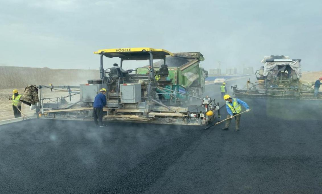 沥青路面铺设现场,油料运输机、摊铺机、压路机等各种机械隆隆作响,高温沥青油料从运料车上倾泻而下,工人们手拿铁铲等工具紧张而有序地进行路面铺设,刚刚摊铺下去的沥青冒着滚滚热气......目之所及,处处是大干快上和如火如荼的火热气氛。