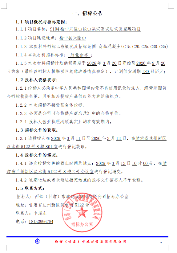 S104榆中兴隆山段山洪灾害灾后恢复重建项目-商品混凝土招标公告