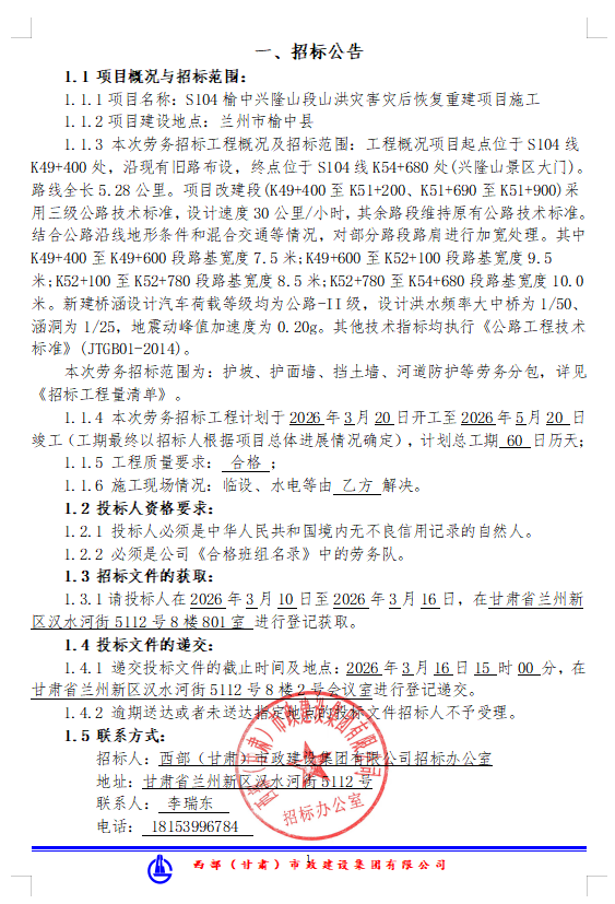 S104榆中兴隆山段山洪灾害灾后恢复重建项目施工-劳务分包招标公告